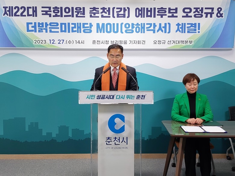 [세계타임즈]최성룡기자 = 더밝은미래당(대표 서정미)과 오정규 선거대책본부와 각계층 시민단체들은 지난 12월 27일(수) 14시 / 춘천시청 8층 브리핑룸에서 “양해각서 체결” 요지의 기자회견을 진행하였다.
