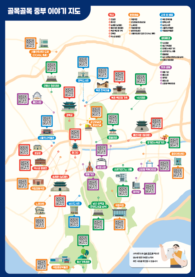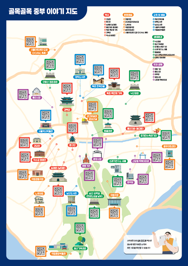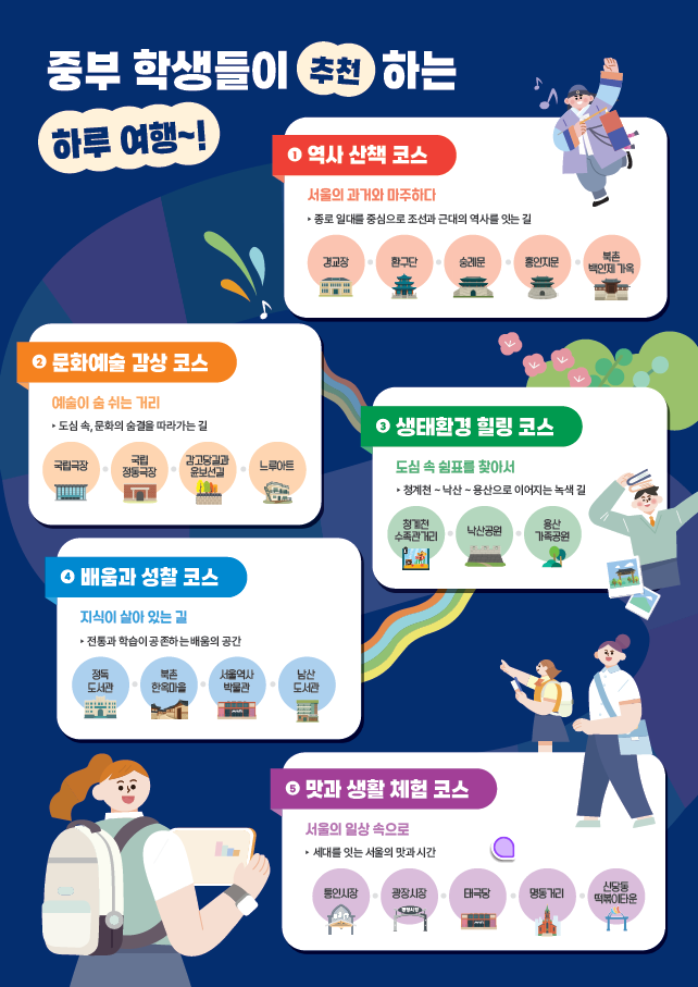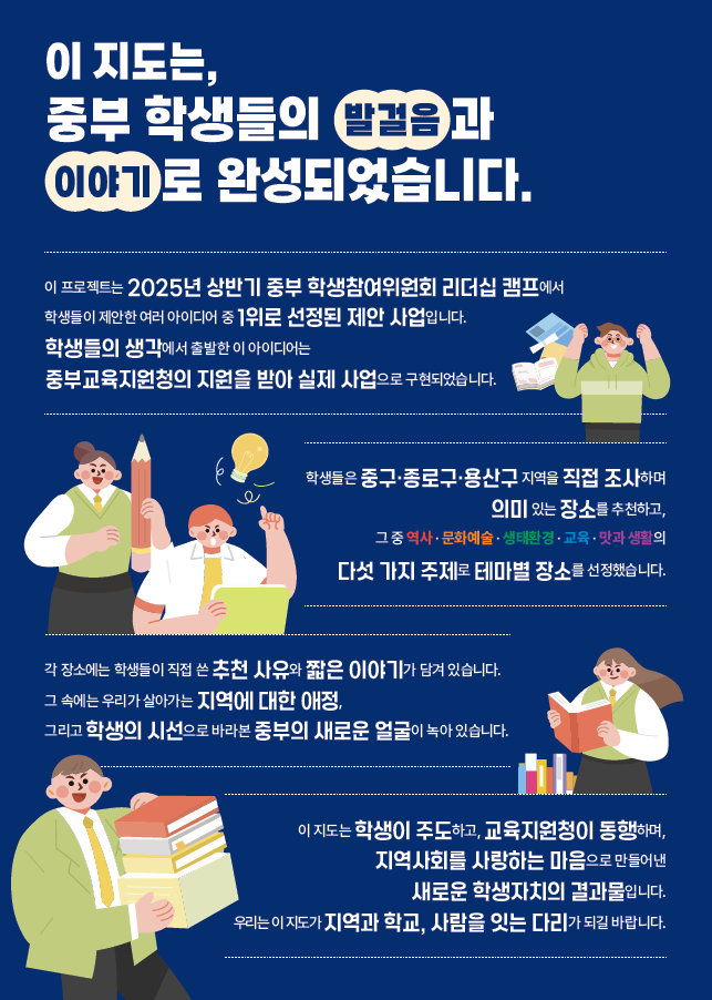 중구·종로구·용산구 지역의 명소 30여 곳을 학생들이 직접 조사하여 ‘역사’, ‘문화예술’, ‘생태환경’, ‘배움과 성찰’, ‘맛과 생활’의 5개 테마 코스로 구성하였으며, 각 장소에는 학생들이 작성한 추천 이유와 짧은 에피소드가 QR코드로 연동되어 있다.