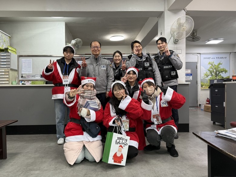 | ▲ 2024. 12. 춤연습 모습, 지구대 방문봉사 후 기념사진을 촬영하는 봉사자들과 경찰관들 |