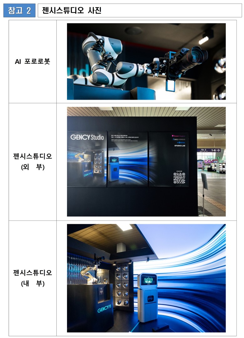 * 젠시 스튜디오 : 혼합현실(MR)·VFX 기반 가상 스크린과 인공 지능(AI) 촬영 로봇, 트레드밀 기술을 결합한 지능형 무인 촬영 시스템으로 사용자의 움직임을 실시간으로 인식하여 자동으로 최적의 촬영 구도와 환경 제공