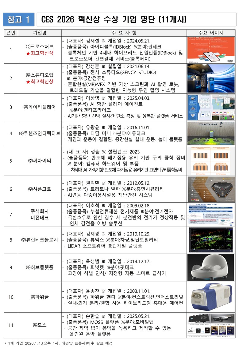 혁신상을 수상한 기업은 ▲㈜씨아이티(반도체 패키징용 초평단 구리 증착 유리) ▲㈜데이터플레어(선박식별 및 탄소배출 모니터링 플랫폼) ▲㈜투핸즈인터랙티브(LiDAR 센서 활용 증강현실 디지털 체육 플랫폼) ▲㈜샤픈고트(AI, IoT활용 재난안전시스템) ▲㈜비젼테크(누설전류제한 비방수 구조 차단기) ▲㈜허브플렛폼(‘피넛캣’-고양이 식별 인식/지정형 자동 스마트 급식기) ▲㈜파워쿨(‘파워쿨 핸디 2026’- 하이브리드형 휴대용 에어컨) ▲㈜뷰런테크놀로지(‘뷰엑스’- LiDAR 소프트웨어 통합개발 플랫폼) ▲㈜모스(올인원 음악 플랫폼) 등 10개 기업이며, 1개 기업은 ‘CES 2026’ 현장에서 발표될 예정이다.