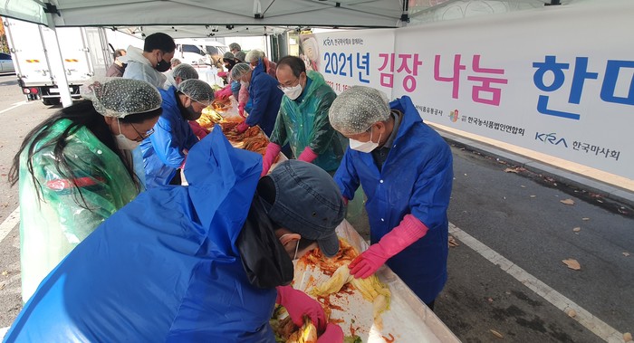 [세계타임즈 심하린 기자]한국마사회는 바로마켓 입점농가와 함께 지난 16일(화) 서울 경마공원에 위치한 야외 바로마켓 행사장에서 취약계층에 김치를 전달하기 위한 ‘김장 나눔 행사’를 시행했다.
