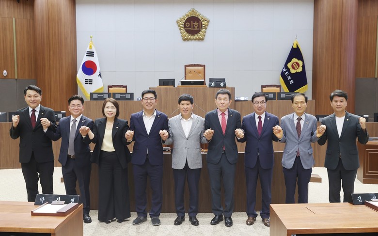 | ▲ 기획경제위원회 안종혁 위원장, 복지환경위원회 김민수 위원장, 농수산해양위원회 이연희 위원장, 오인철 제2부의장, 홍성현 의장, 정광섭 제1부의장, 행정문화위원회 박기영 위원장, 건설소방위원회 고광철 위원장, 교육위원회 이상근 위원장 |