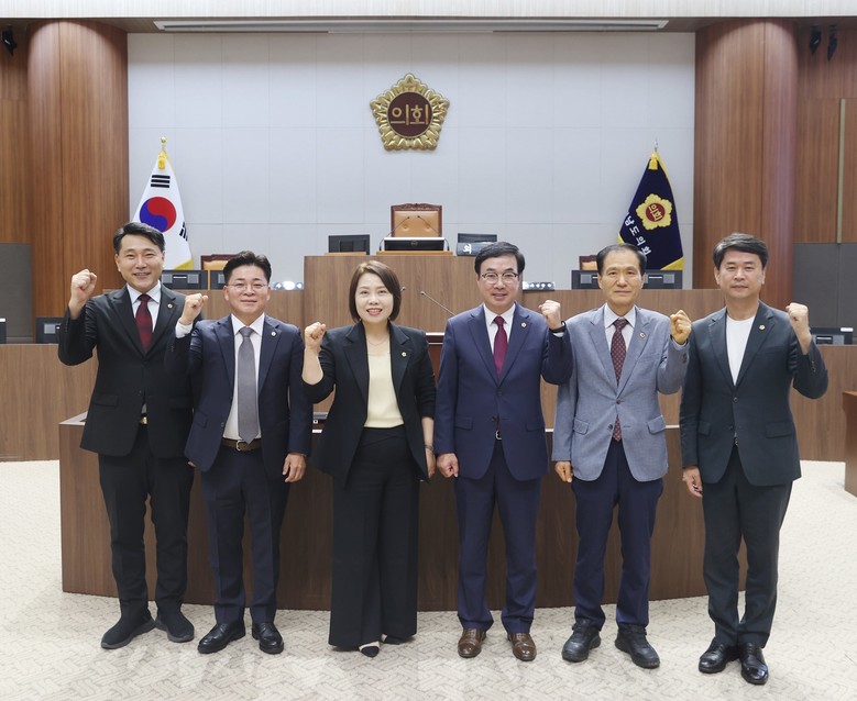 | ▲ 왼쪽부터 기획경제위원회 안종혁 위원장, 복지환경위원회 김민수 위원장, 농수산해양위원회 이연희 위원장, 행정문화위원회 박기영 위원장, 건설소방위원회 고광철 위원장, 교육위원회 이상근 위원장 |