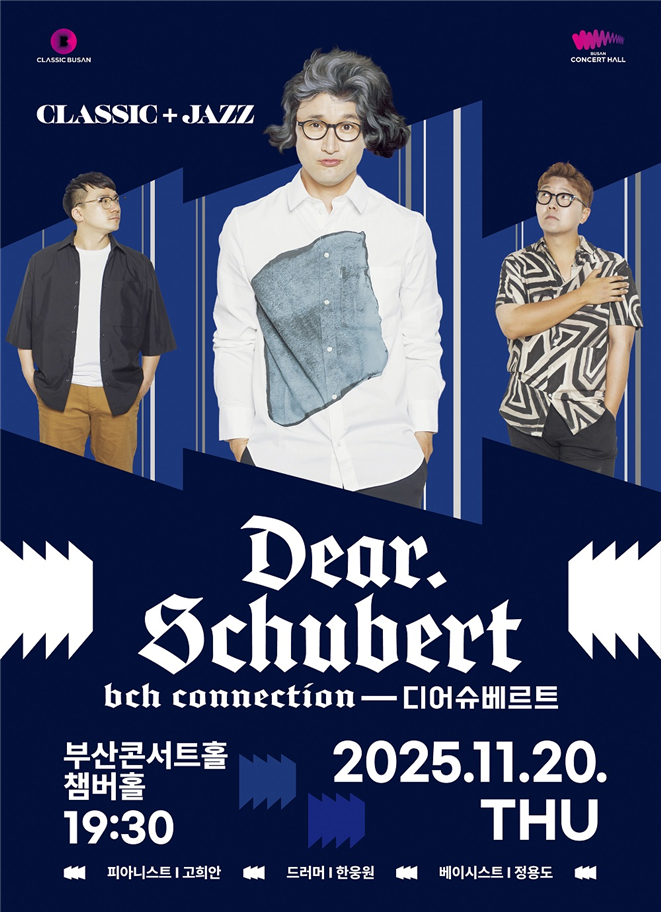 ◈ 예매는 ▲부산콘서트홀 누리집 ▲놀(NOL) 인터파크티켓에서 가능해 [부산 세계타임즈=이용우 기자] 부산시 클래식부산은 오는 11월 20일 저녁 7시 30분 챔버홀에서 ▲피아니스트 고희안 ▲드럼 한웅원 ▲베이스 정용도와 클래식부산 오케스트라 수석들이 주축이 된 「부산콘서트홀 커넥션-디어 슈베르트」(이하 디어 슈베르트)의 공연을 개최한다고 밝혔다.