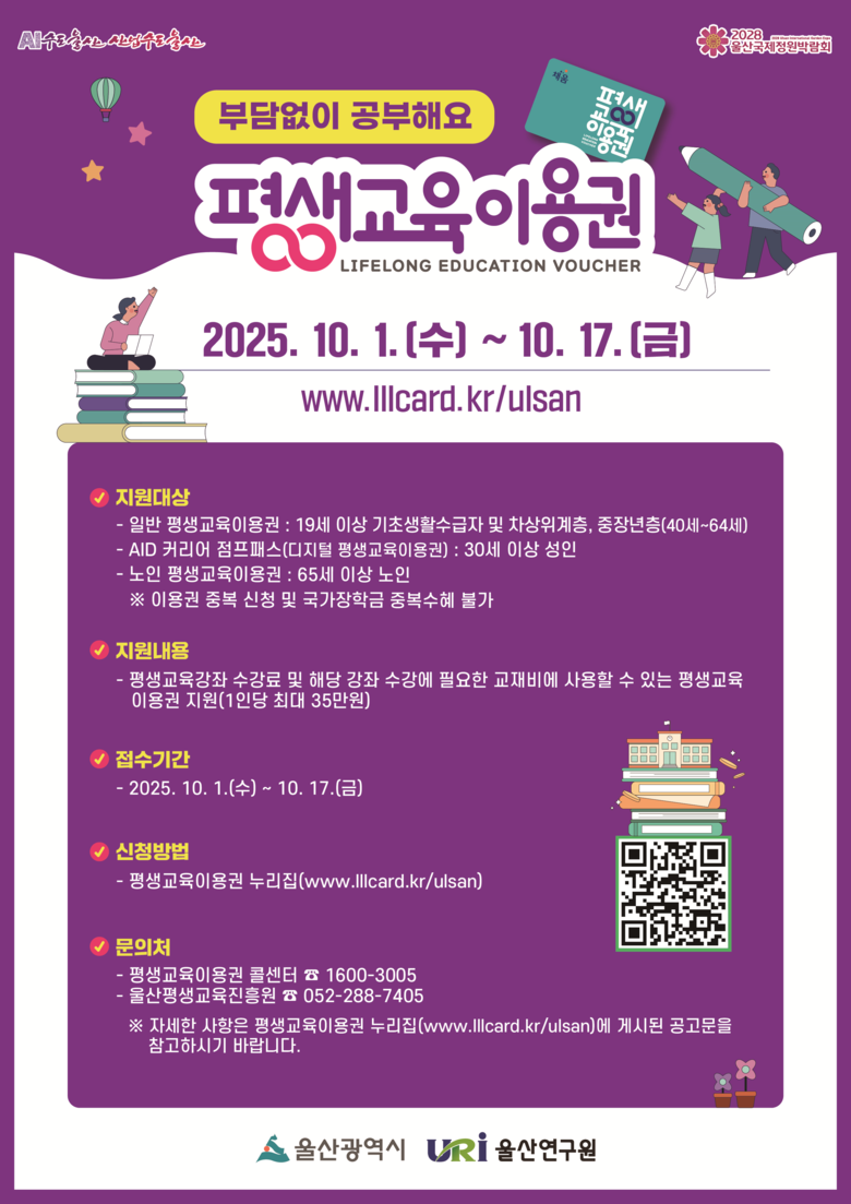 신청 기한은 오는 10월 1일부터 17일까지이며 평생교육이용권 누리집(www.lllcard.kr/ulsan)을 통해 접수한다.