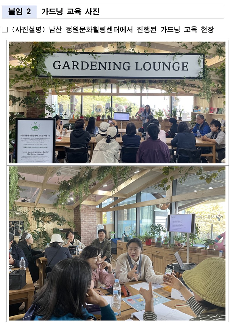 금번 행사를 위해 지난 9~10월 시민정원사를 모집하였고, 남산 정원문화힐링센터에서 가드닝 교육이 진행되었다. 시민정원사 45명이 참여해 총 3회에 걸친 교육과정을 수료하였으며, ▲ 정원의 가치와 저관리형 정원 개념 이해 ▲ 지속가능한 정원 디자인 구상 ▲ 현장 실습 및 유지관리 방안 검토 등 정원사에게 필요한 실무 중심의 교육이 진행되었다. 교육을 통해 참가자들은 정원을 만들 수 있는 기초 역량을 쌓았으며, 이번 본 행사에서 그 결과를 직접 선보일 예정이다.