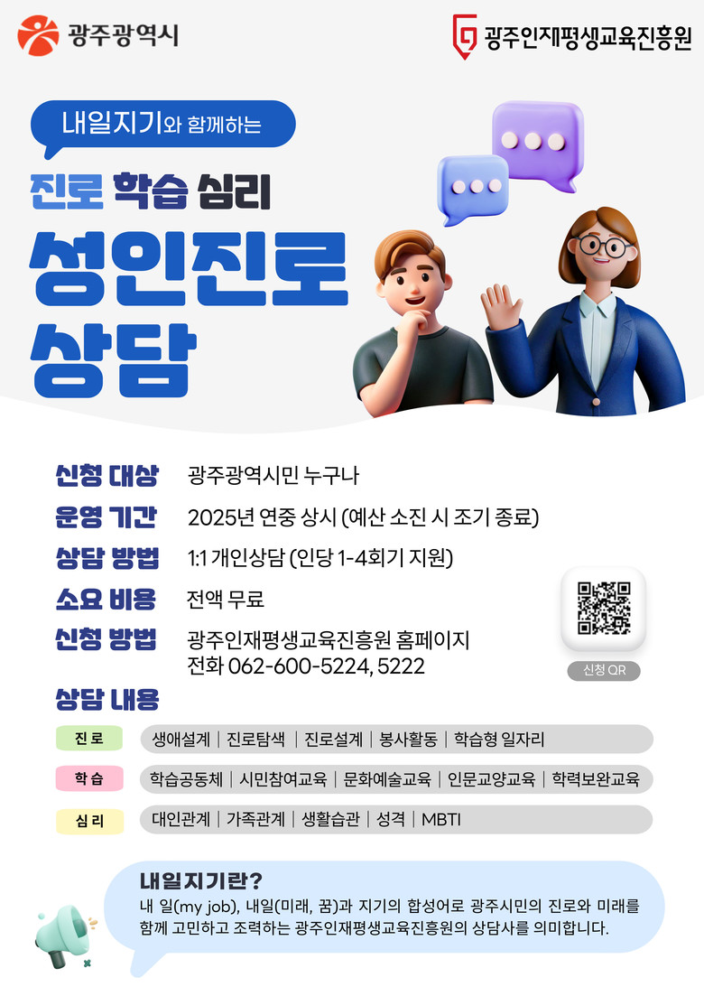 성인진로상담 서비스는 급변하는 사회 및 직업 환경 속에서 진로·학습·심리 등 다양한 영역에서의 맞춤형 상담을 통해 광주시민의 삶의 질 향상과 진로 재설계를 돕는 것을 목표로 한다.