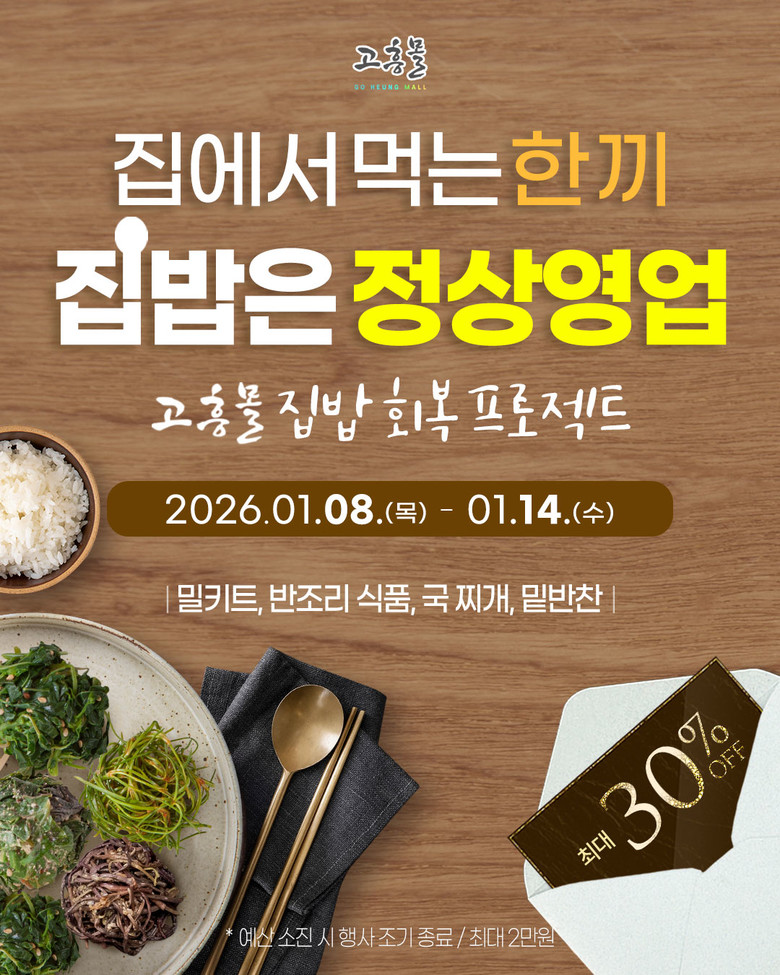 이번 행사는 ‘집에서 먹는 한 끼, 집밥은 정상영업’을 주제로, 밀키트·반조리 식품·국·찌개류·밑반찬 등 집에서 손쉽게 준비할 수 있는 상품을 중심으로 최대 30% 할인 혜택을 제공한다. 행사 기간은 1월 8일부터 14일까지다.