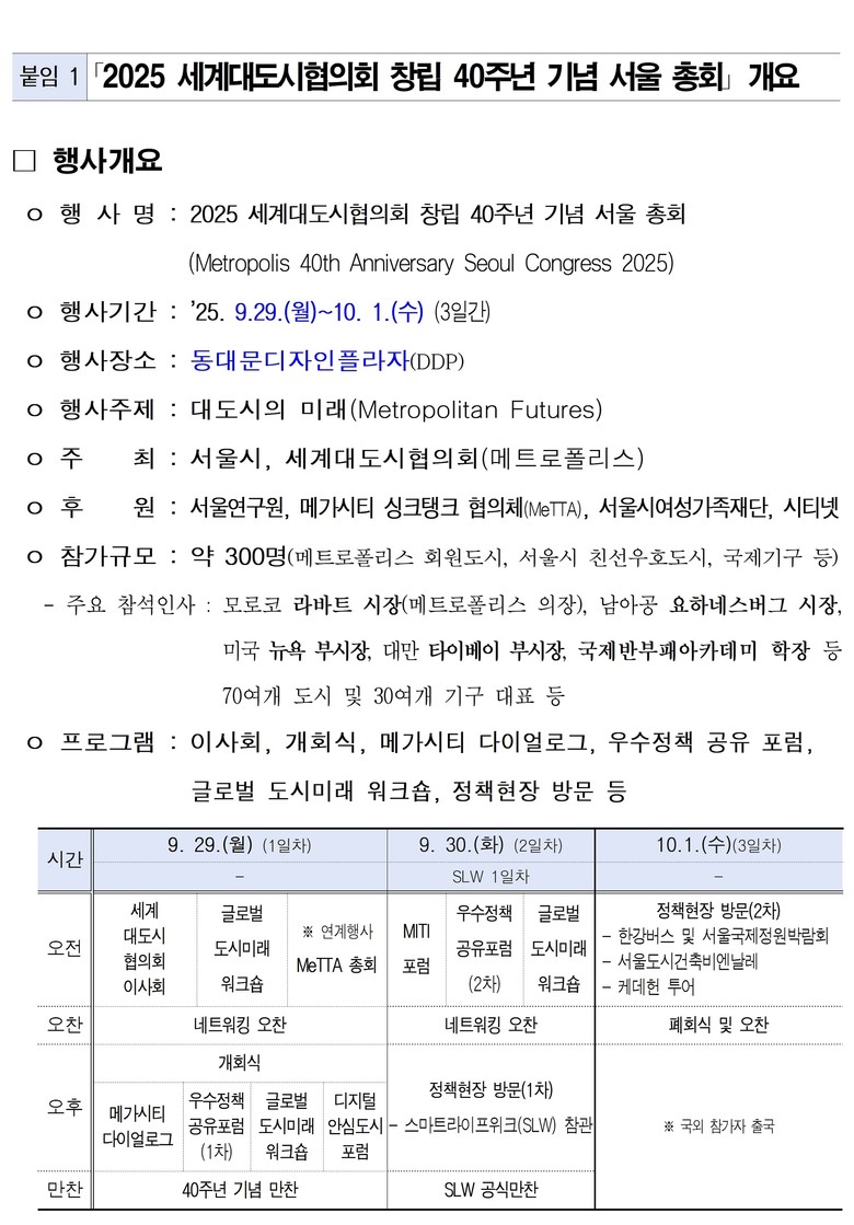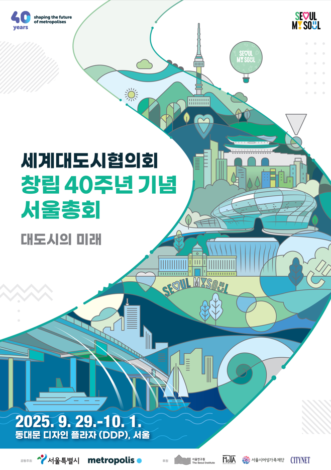 9월 29일(월)~10월 1일(수) 사흘간 동대문디자인플라자에서 「2025 세계대도시협의회 창립 40주년 기념 서울 총회」가 진행된다. 올해 총회는 제15차 회의로 세계대도시협의회(World Association of the Major Metropolises) 이른바 ‘메트로폴리스(Metropolis)’ 창립 40주년을 기념한 행사이며, 2002년 제7차 총회 이후 두 번째로 서울에서 개최된다.