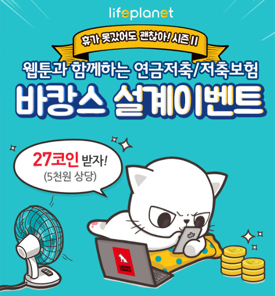 라이프플래닛은 오는 9월 17일까지 스마트폰을 통해 ‘(무)꿈꾸는e저축보험Ⅱ’ 및 ‘(무)라이프플래닛e연금저축보험’의 보험료 설계에 참여한 모든 고객에게 레진코믹스에서 이용 가능한 5천원 상당(27코인)의 쿠폰을 증정한다.