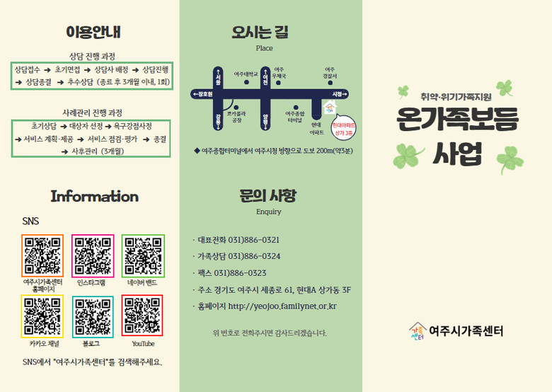 여주시가족센터(센터장 박지현)는 2026년에도 상담 및 사례관리를 지속적으로 운영하여 여주시의 다양한 가족이 안정적으로 가정생활을 유지할 수 있도록 생애주기 맞춤형 통합 서비스를 제공할 예정이다.