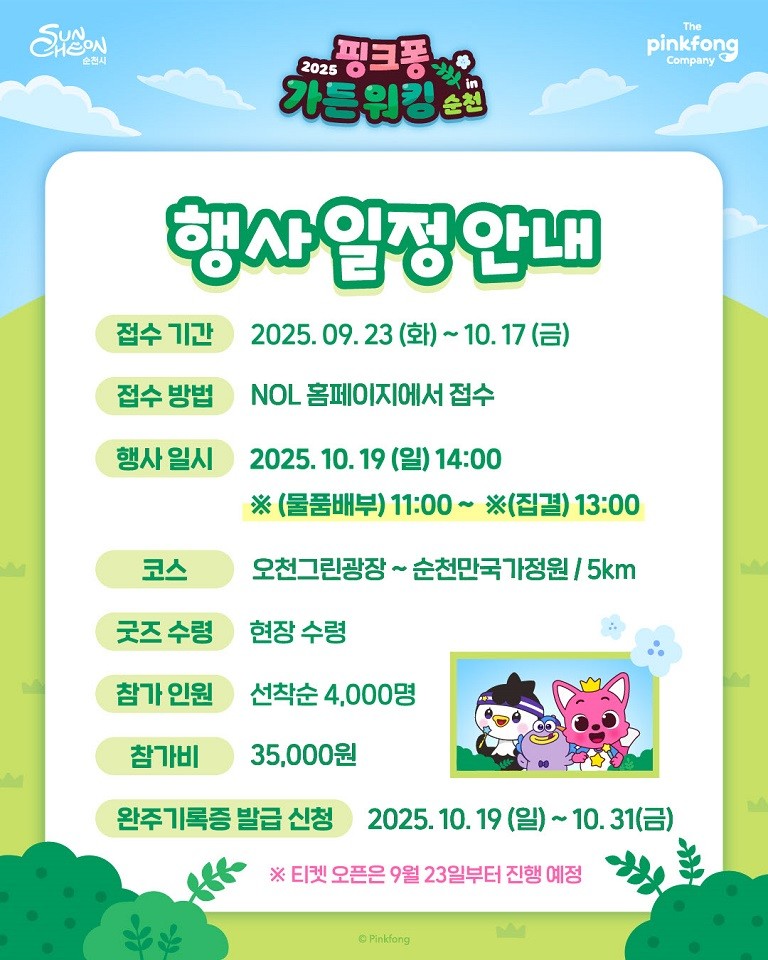 - 10월 19일 그린아일랜드~국가정원 5km 코스, 굿즈·공연·포토존까지 종합 선물 - [순천시 세계타임즈=우덕현 기자] 순천시(시장 노관규)와 글로벌 패밀리 엔터테인먼트 기업 더핑크퐁컴퍼니(대표 김민석)가 함께 기획한 ‘핑크퐁 가든 워킹’이 오는 10월 19일에 첫 선을 보인다.