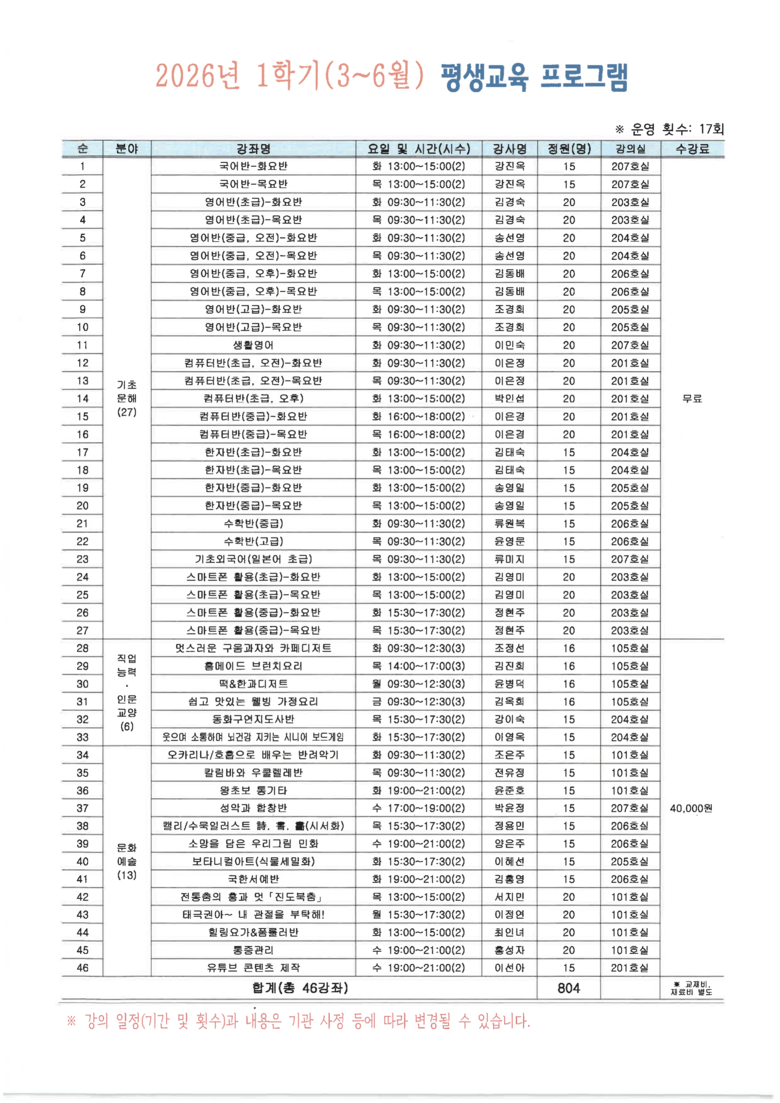 이번 학기에는 공모를 통해 선정된 46개 프로그램과 지역 우수강사의 재능을 활용한 12개 재능기부 프로그램 등 총 58개 강좌를 운영한다. 교육 과정은 영어 및 컴퓨터 등 기초문해 과정, 요리 및 동화구연지도사 등 직업능력·인문교양 과정, 통기타·민화·태극권 등 문화예술 과정으로 구성했다. 상반기 교육은 3월 3일부터 6월 29일까지 17주간 진행할 예정이다.
