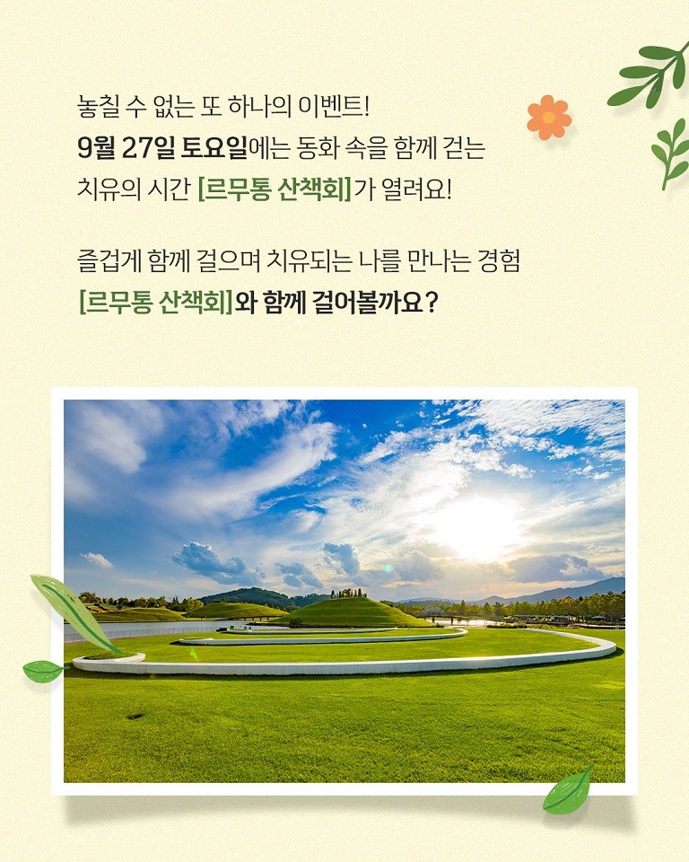 특히 오는 27일 진행되는 ‘르무통 산책회’는 동화세상속으로 들어온듯한 가을 향기 가득한 순천만국가정원의 아름다운 풍경속을 대회 사전신청자 500명과 현장에서 참여한 관광객들이 속도와 시간, 순위에 상관없이 즐거운 음악공연과 함께 정해진 코스를 걸으면서 몸과 마음이 치유되는 시간을 갖는다.