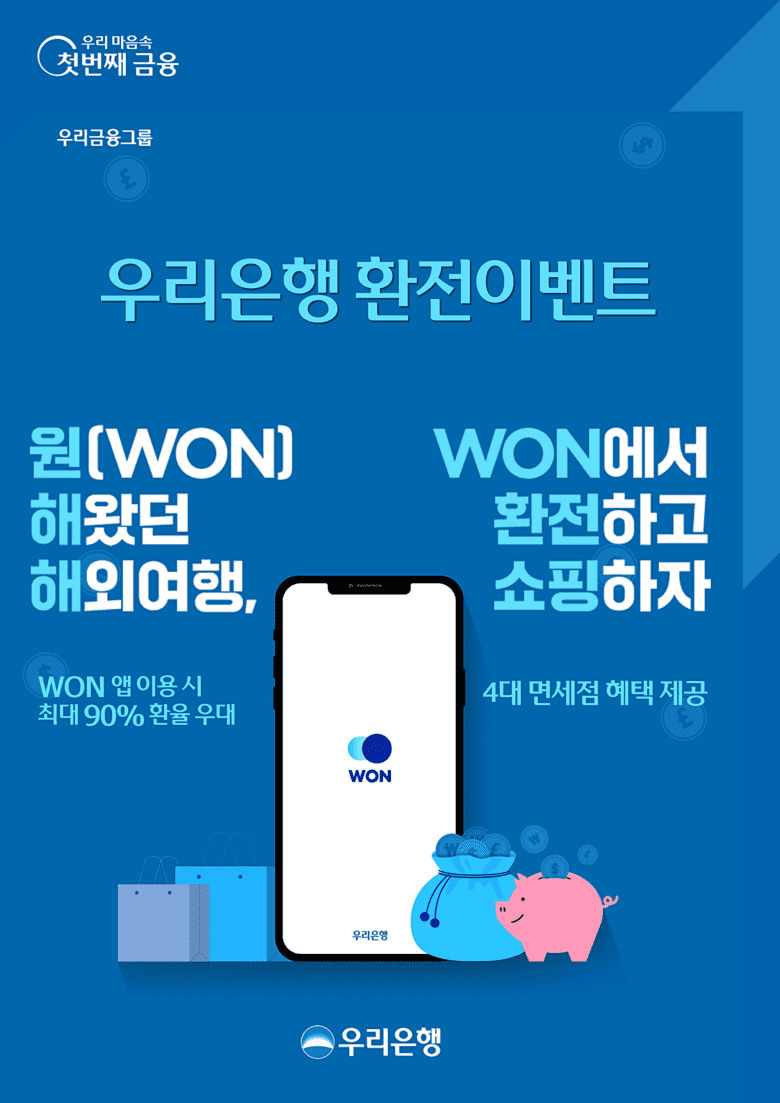 이번 이벤트는 우리WON뱅킹 內 비대면 환전서비스인 ‘환전주머니’에서 환전 신청을 완료하고 연결 배너에서 면세점 혜택 제공 페이지로 이동해 혜택을 받을 수 있다. 또한, 해당 면세점 공식 모바일 앱에서도 우리WON뱅킹 內 ‘환전주머니’로 이동해 환전 혜택을 받을 수 있다. 이벤트 참여 고객은‘환전주머니’에서 US달러 기준 최대 90% 환율 우대를 받고, 인천공항 및 우리은행 지점에서 원하는 날짜에 편하게 환전한 외화를 수령 할 수 있다.