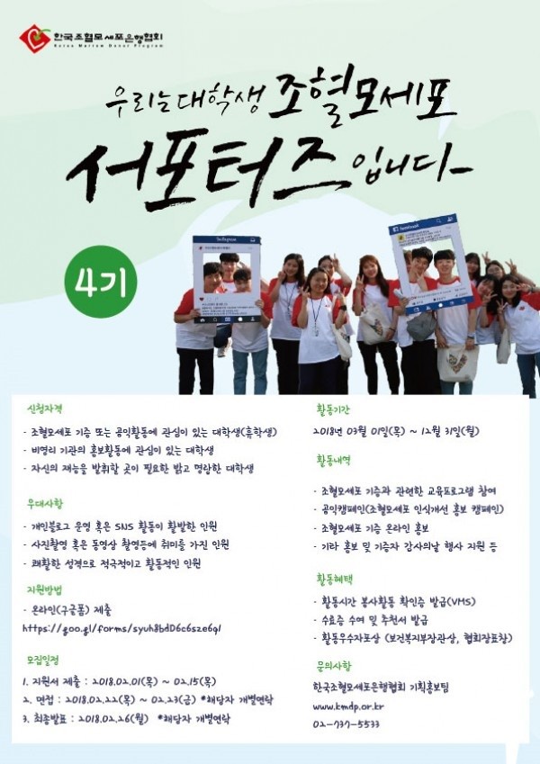서포터즈의 자격 요건은 조혈모세포 기증 또는 공익활동 등 비영리 기관의 홍보 활동에 관심이 있는 대학생이라면 누구나 지원할 수 있다.