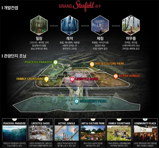 신세계프라퍼티가 제출한 어등산관광단지 개발 콘셉트는 ‘숲·빛·별·삶이 어우러진 대한민국 대표 랜드마크 관광단지 조성’이다. ‘숲&힐링’, ‘빛&여가’, ‘별&체험’, ‘삶&머무름’의 4가지 테마를 설정하고, 유원지 부지 내 6개의 공간 구성을 통해 체류형 복합 관광단지를 완성한다는 구성이다.