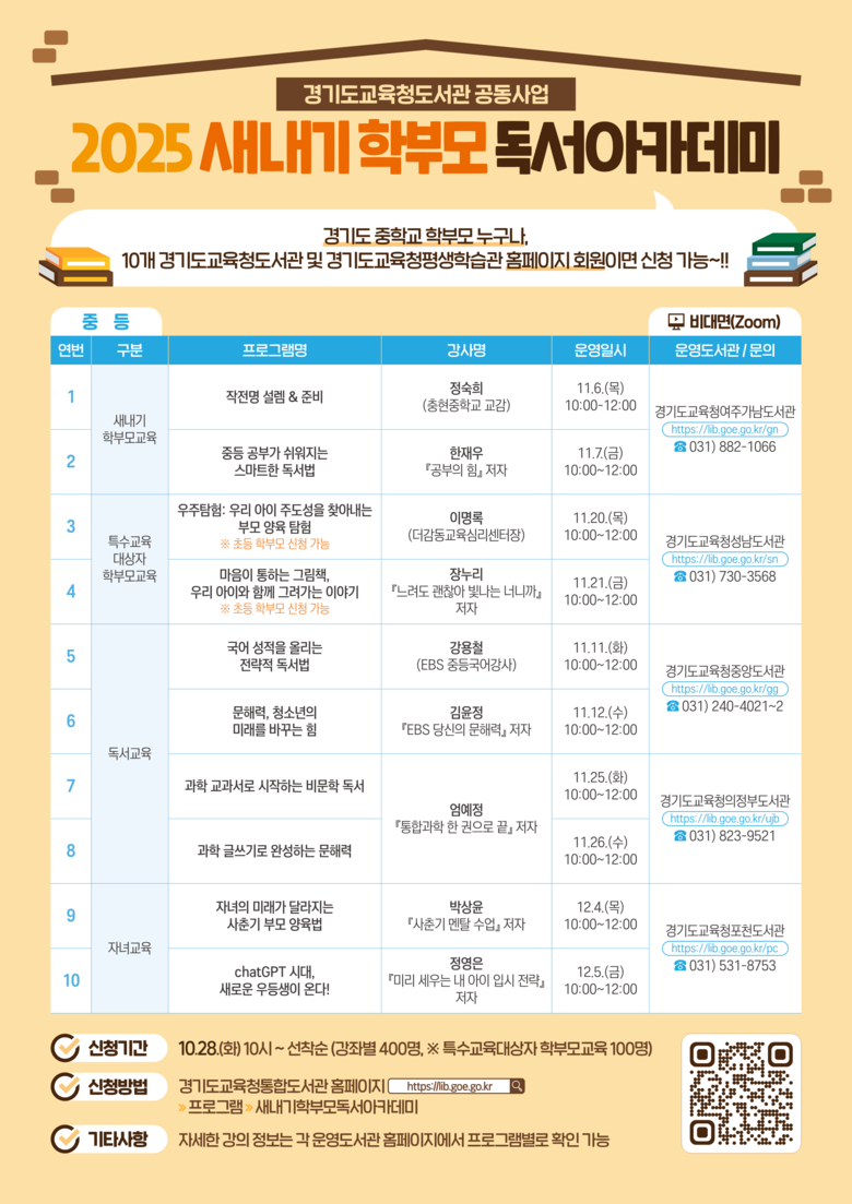 중학생 학부모 대상 강좌는 ▲중등 공부가 쉬워지는 스마트한 독서법 ▲우리 아이 주도성을 찾아내는 부모 양육 탐험 ▲문해력, 청소년의 미래를 바꾸는 힘 ▲과학 교과서로 시작하는 비문학 독서 ▲chatGPT 시대, 새로운 우등생이 온다를 운영한다.