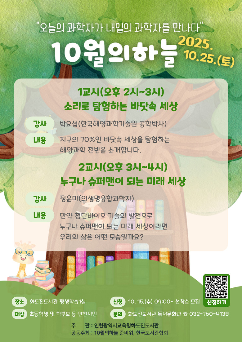 참여는 인천시민 누구나 가능하며, 10월 15일(수) 오전 9시부터 화도진도서관 누리집(http://lib.ice.go.kr/hwadojin)에서 신청할 수 있다.