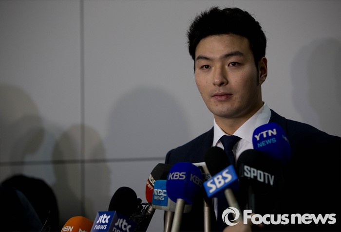 △ 미국 메이저리그 미네소타 트윈스와 계약을 준비중인 야구선수 박병호가 지난달 29일 오후 인천국제공항에서 출국 전 기자회견을 열고 입장을 발표하고 있다. <사진제공=포커스뉴스>