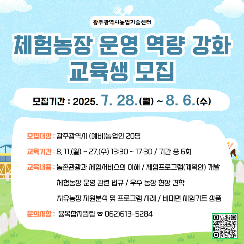 모집대상은 광주광역시 거주 체험농장 운영자 또는 관심 있는 시민 20명이다. 교육 참여 희망자는 8월 6일까지 교육신청서와 관련 서류를 농업기술센터를 방문하거나 이메일 또는 팩스로 제출하면 된다.