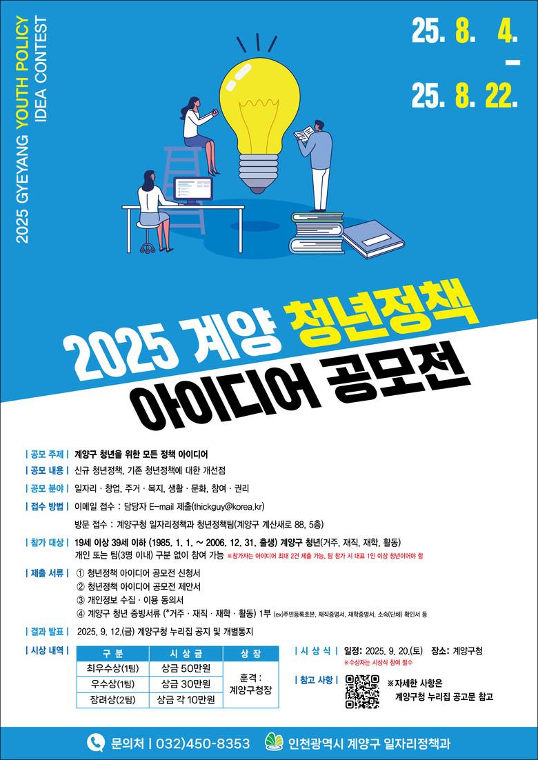 - 청년이 만드는 정책, 청년이 바꾸는 미래 - [계양구 세계타임즈=심하린 기자] 인천광역시 계양구(구청장 윤환)가 청년들의 참신한 생각을 정책으로 실현하기 위해 ‘2025 계양 청년정책 아이디어 공모전’을 개최한다.
