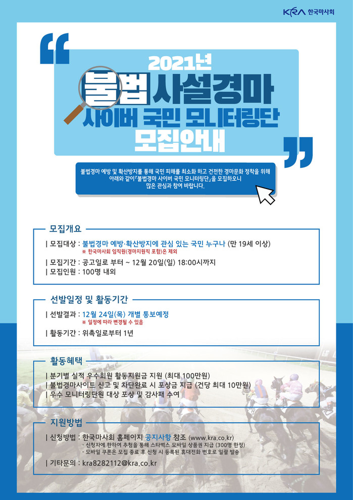 그러나 독버섯처럼 자라나는 수많은 불법사이트를 자체적으로 단속하기에는 시간과 인력이 턱없이 부족한 실정이다. 이에 한국마사회는 ‘불법경마 사이버 국민 모니터링단’을 발족해 국민 참여를 통한 효과적 근절에 나선다. 위촉 후 1년간 불법경마사이트 및 홍보글 감시·신고, 불법사설경마 근절을 위한 아이디어를 제안하는 일을 하게 된다. 자신이 신고한 사이트가 폐쇄되면 1건당 최대 10만원의 포상금을 받게 되고, 분기별 실적이 우수하다면 최대 100만원의 활동지원금도 받을 수 있다.