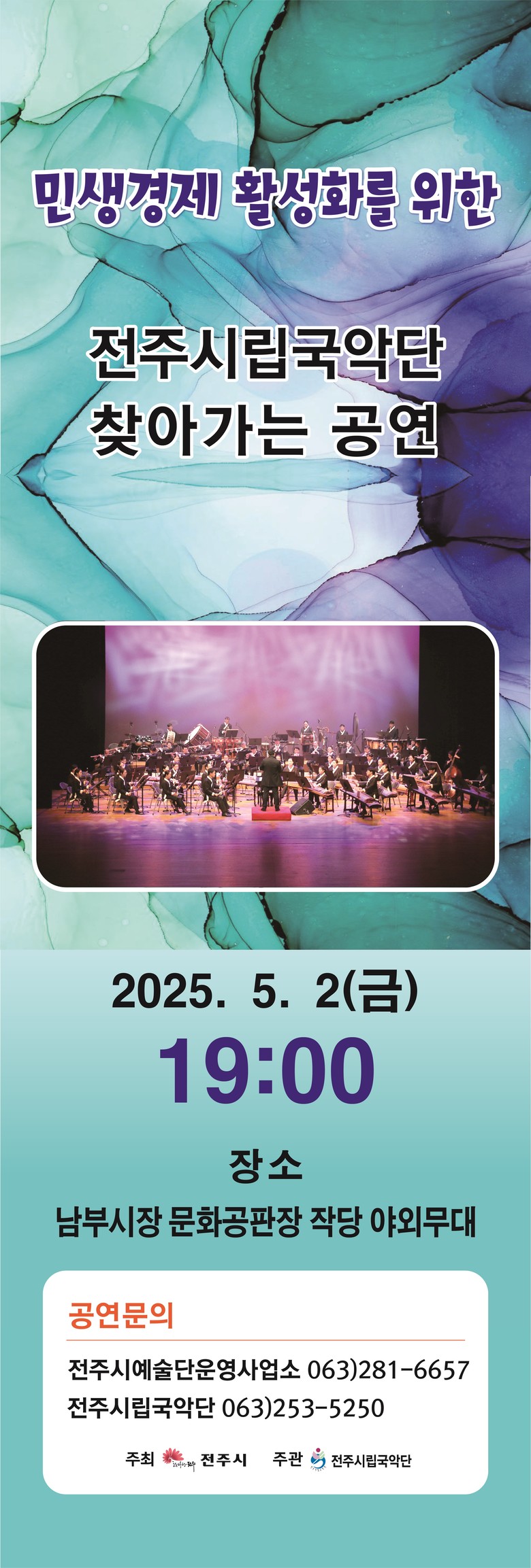 [전주시 세계타임즈=이채봉 기자] 전주시립국악단(예술감독 겸 지휘자 심상욱)은 오는 5월 2일(금) 오후 7시, 전주 남부시장 문화공판장 작당 야외무대에서 시민들과 함께하는 찾아가는 국악 공연을 선보인다.