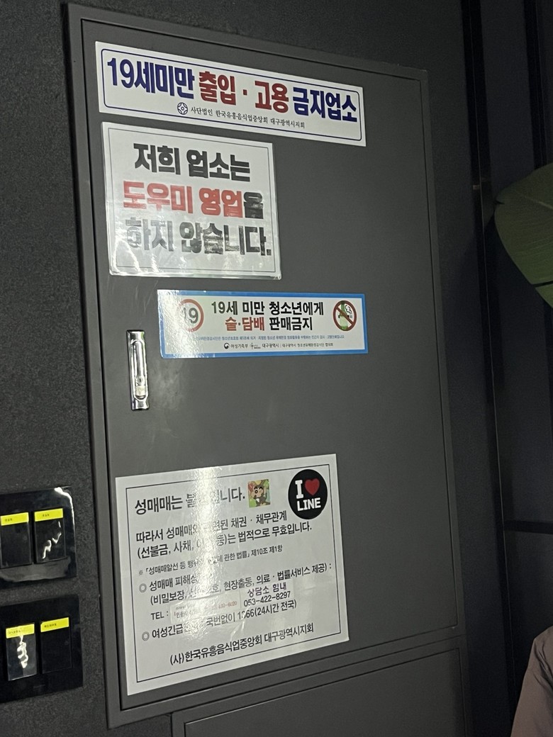 한편, 2012년 8월부터 성매매 방지와 피해자 보호를 위해 ‘성매매방지 및 피해자 보호 등에 관한 법률’에 따라 유흥주점에 성매매 방지 안내 관련 게시물을 의무적으로 부착하도록 규정돼 있다.