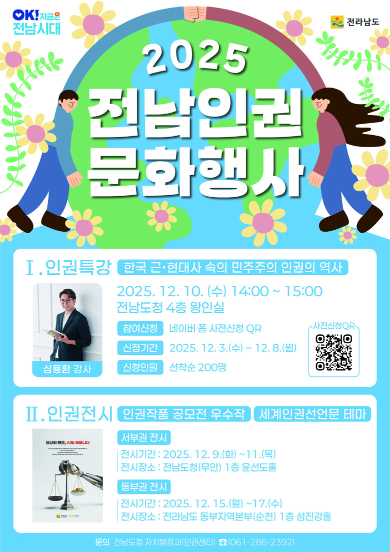 9일부터 11일까지는 전남도청 윤선도홀에서 ‘2025 전라남도 인권공모전 우수작’과 ‘세계인권선언문 테마’를 전시한다. 이어 15일부터 17일까지는 전남도 동부지역본부 섬진강홀에서 전시회를 진행한다.