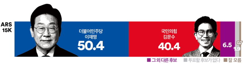 [세계타임즈 = 심귀영 기자] 이번 대선에서 누구에게 투표할 것인지 묻는 양자 가상대결 질문에 대해, 더불어민주당 ‘이재명’ 후보는 50.4%의 지지율을 기록해 국민의힘 ‘김문수’ 후보(40.4%)보다 10.0%p 높게 나타났다. ‘그 외 다른 인물’은 6.5%, ‘투표할 인물이 없다’는 응답은 1.9%였다.