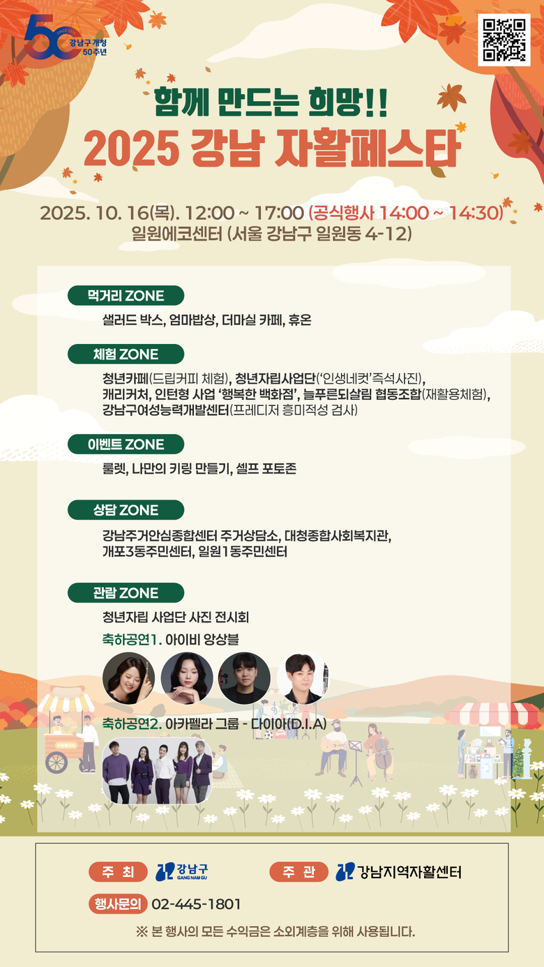 조성명 강남구청장은 “이번 행사가 자활사업 참여자들이 주인공이 되어 활동을 적극적으로 홍보하고 주민들과 서로 어울려 함께할 수 있는 공동체 문화를 만들어가는 자리가 되길 바란다”며 “구민 누구나 더 많은 기회를 통해 성장하고 경제적으로 자립할 수 있도록 맞춤형 자활사업을 더욱 활성화시켜 나가겠다”고 밝혔다.