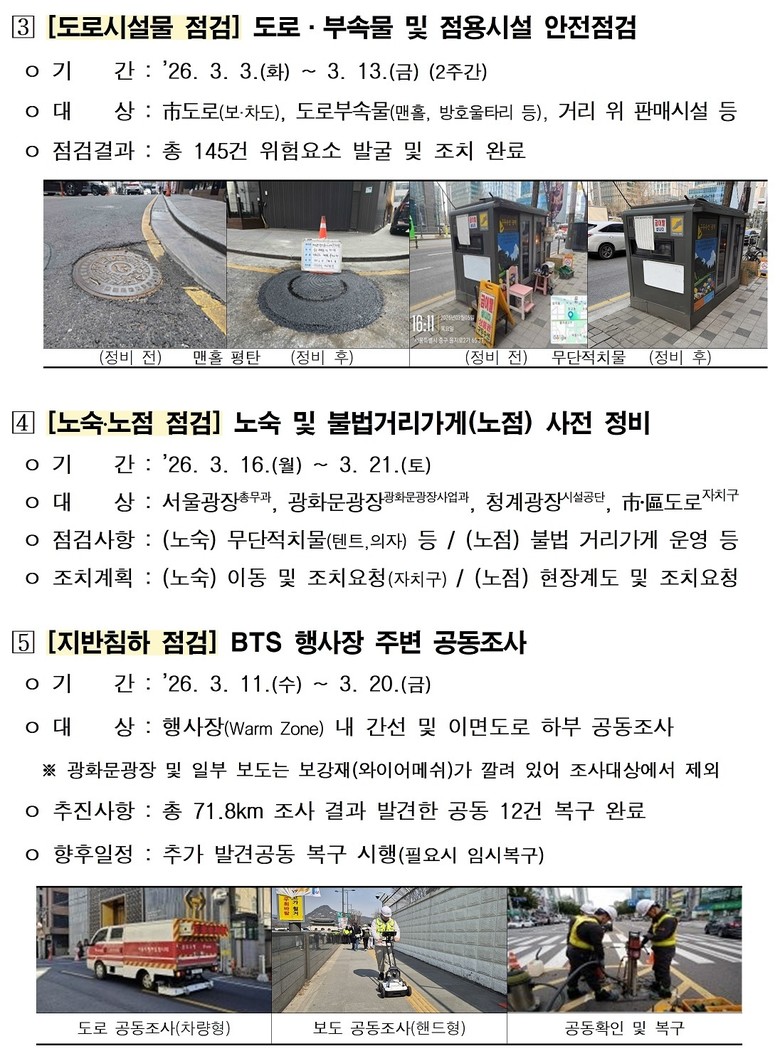 서울시는 광화문광장과 도심을 무대로 한 대규모 공연이 안전하게 이뤄질 수 있도록, 공연이 결정된 직후인 2월 4일 오세훈 시장 주재 점검회의를 시작으로 관계기관 및 주최 측과 협력해 안전관리 대책을 선제적으로 준비‧가동했다고 덧붙였다.