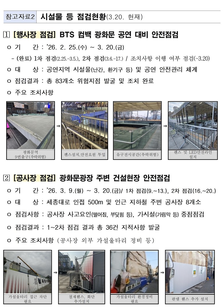 공연 이틀 전인 19일(목)에는 오 시장이 관계기관, 주최측과 광화문 일대를 직접 찾아 무대 주변부터 지하철 출입구, 동선 분리를 위한 안전 펜스 설치 상태까지 합동 점검하며 재차 준비상황을 확인했다.