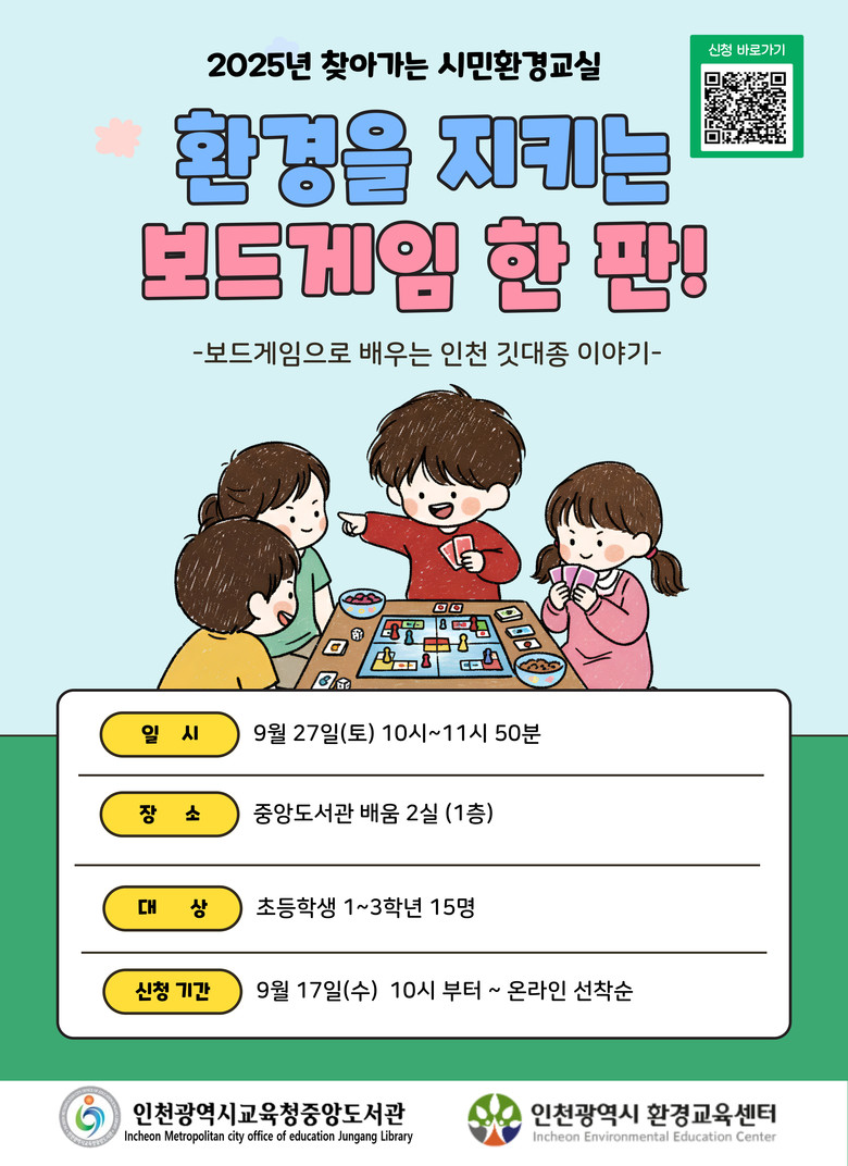 관내 초등학교 1~3학년 15명을 대상으로 진행되는 이번 프로그램은 어린이들이 보드게임을 통해 인천의 깃대종과 생물 다양성을 쉽고 재미있게 배우도록 기획됐다.