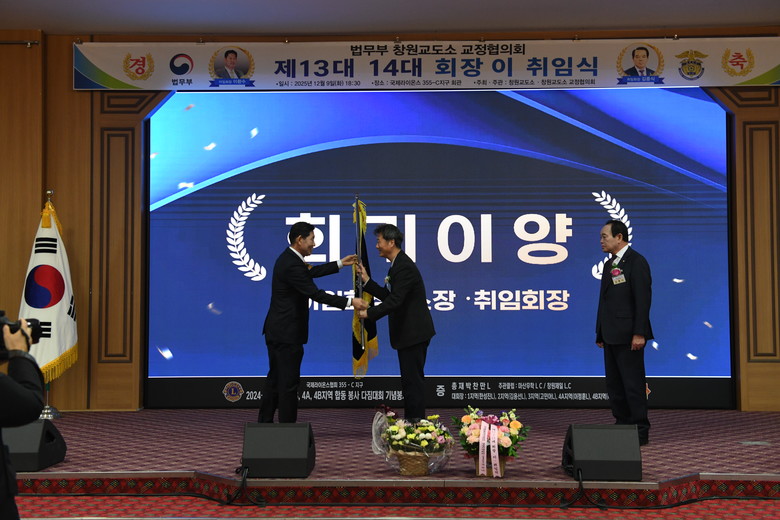 [세계타임즈]최성룡기자 =12월9일(화)18시:30분 국제라이온스협회355C지구회관 4층에서 법무부 창원교도소 교정협의회 제13대.(회장 이환수) 14대.회장(회장 김종식) 이.취임식을 갖었다.