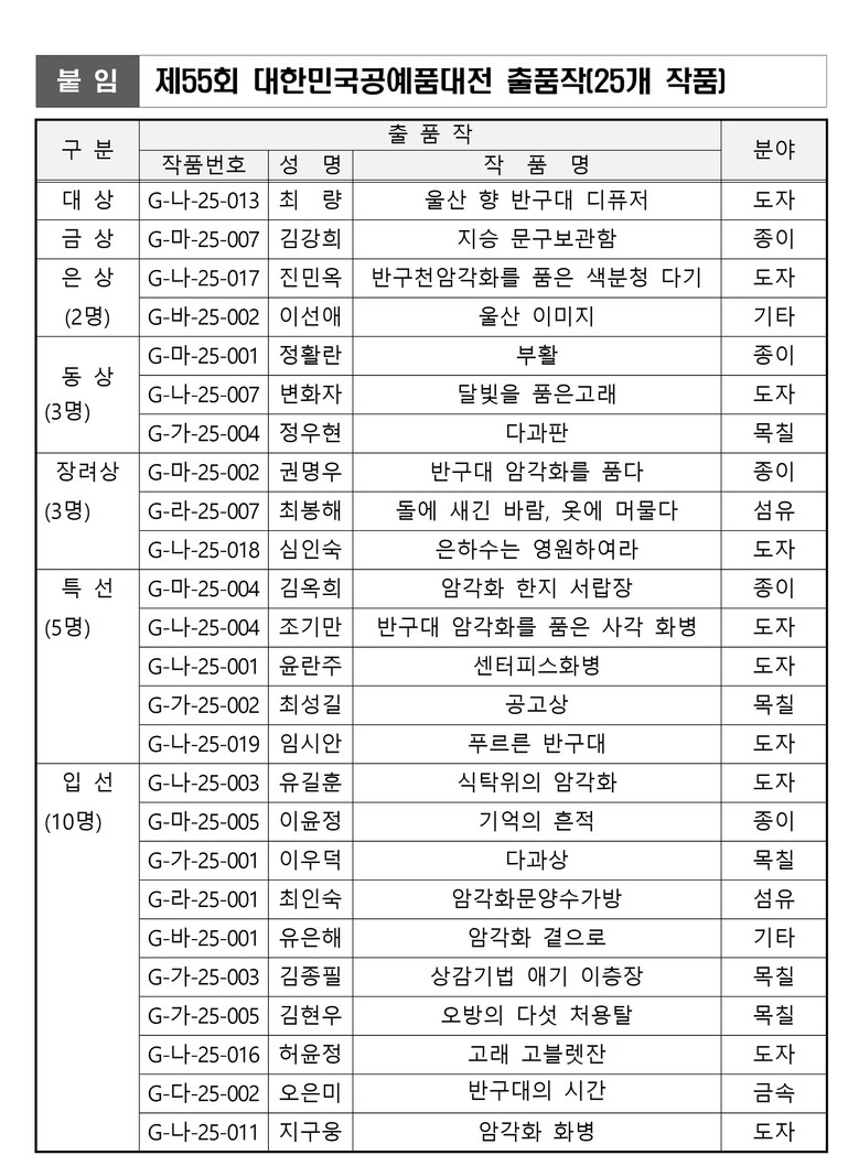 이번 출품작들은 지난 6월 열린 ‘제26회 울산광역시공예품대전’ 수상작으로, 목칠·섬유·금속·도자·종이·기타 등 6개 분야의 다양한 작품이 포함됐다.