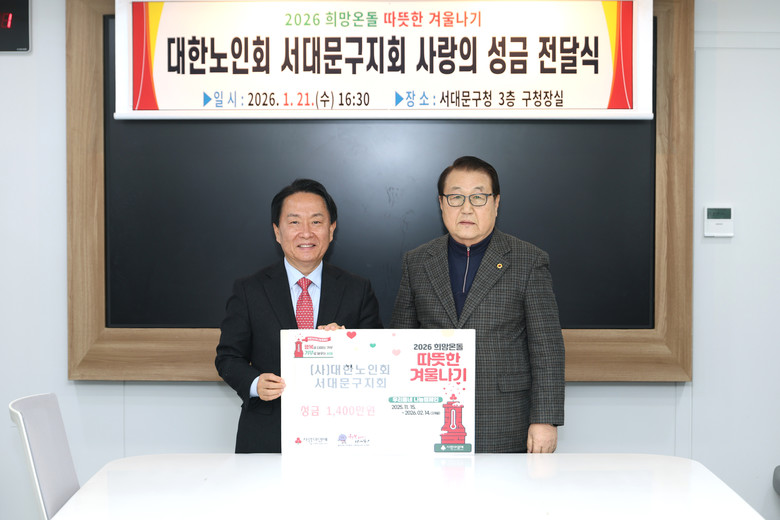 [서대문구 세계타임즈=이장성 기자] 서대문구(구청장 이성헌)는 대한노인회 서울 서대문구지회(지회장 손성인)가 관내 취약가구를 위해 ‘2026 희망온돌 따뜻한 겨울나기’ 성금 1,400만 원을 기탁했다고 22일 밝혔다.