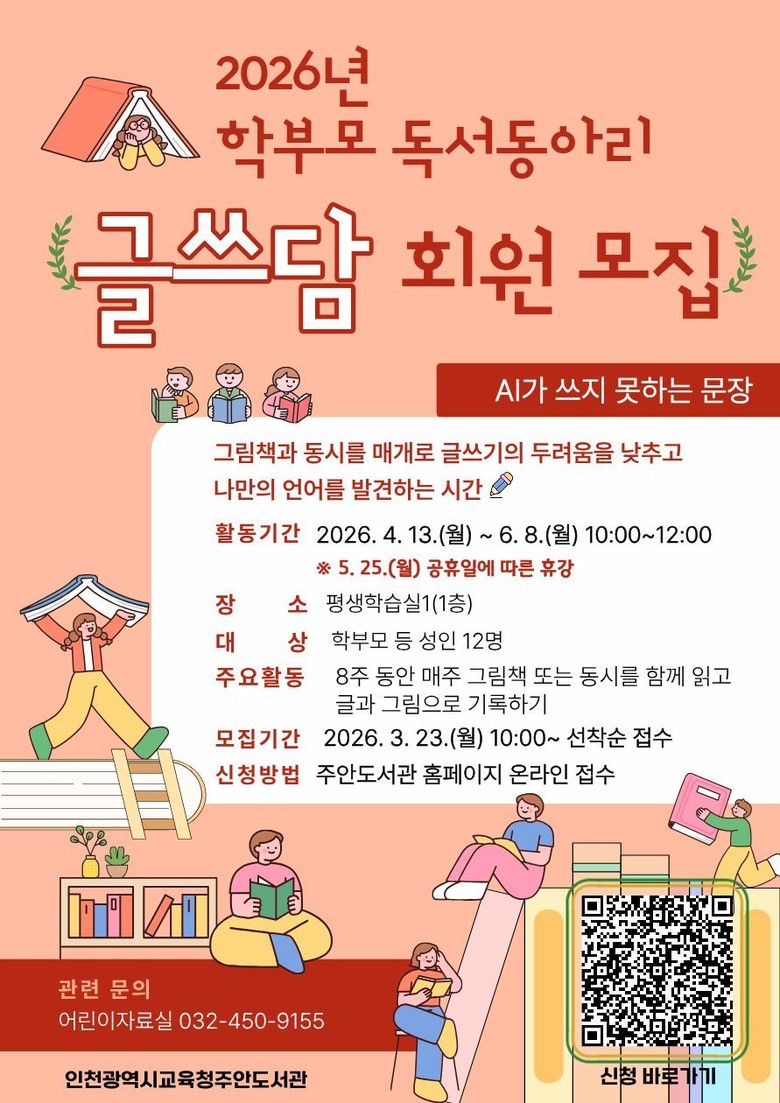 프로그램 운영 기간은 4월 13일부터 6월 8일까지이며, 주안도서관 누리집에서 3월 23일 오전 10시부터 선착순으로 모집한다.