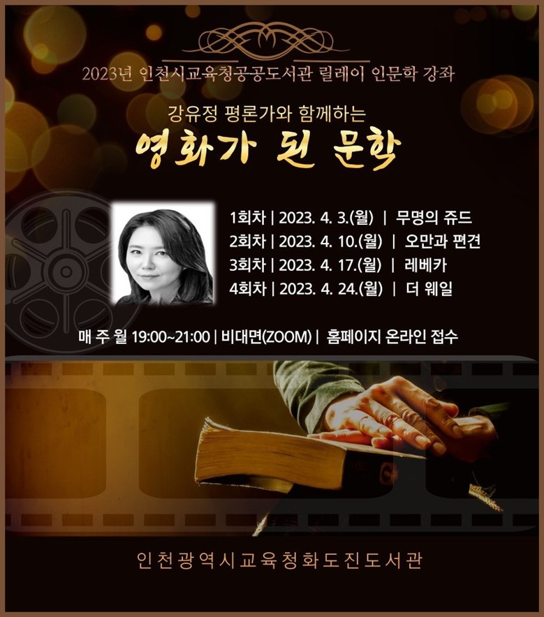 [인천 세계타임즈=심하린 기자] 인천광역시교육청화도진도서관(관장 강신호)은 청소년과 성인을 대상으로 강유정 평론가와 인문학 강좌 ‘영화가 된 문학’을 4월 3일부터 24일까지 매주 월요일 비대면(ZOOM)으로 운영한다.