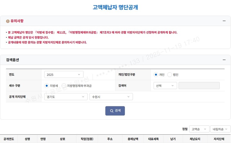 수원특례시 홈페이지에서 고액·상습 지방세 체납자 175명 명단 확인할 수 있다