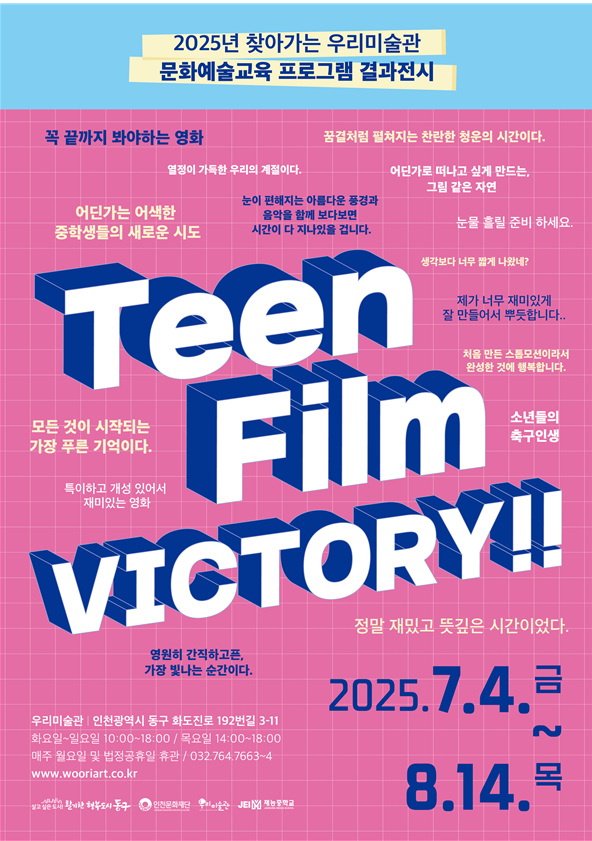 이번 전시에서 창의적이고 열정 넘치는 미디어아트(영상 작품)를 만날 수 있다. 2025년에는 동구청 청소년들에게 예술체험과 교육의 기회를 확대하고자하는 취지로 ‘찾아가는 우리미술관 문화예술교육’을 계획했다. 인천 동구청에서 관내 학교에 교육 참여를 안내하고 희망한 학교인 재능 중학교를 접수받아, 3학년 전체 학생이 16차시 동안 교육에 참여했다. 교육에 참여한 재능중학교 5개 반 학생들이 미디어 아티스트인 김용현 작가와 함께 미디어아트 작품을 제작하고, 학생들의 작품을 모아 우리미술관에서 전시회를 개최한다.