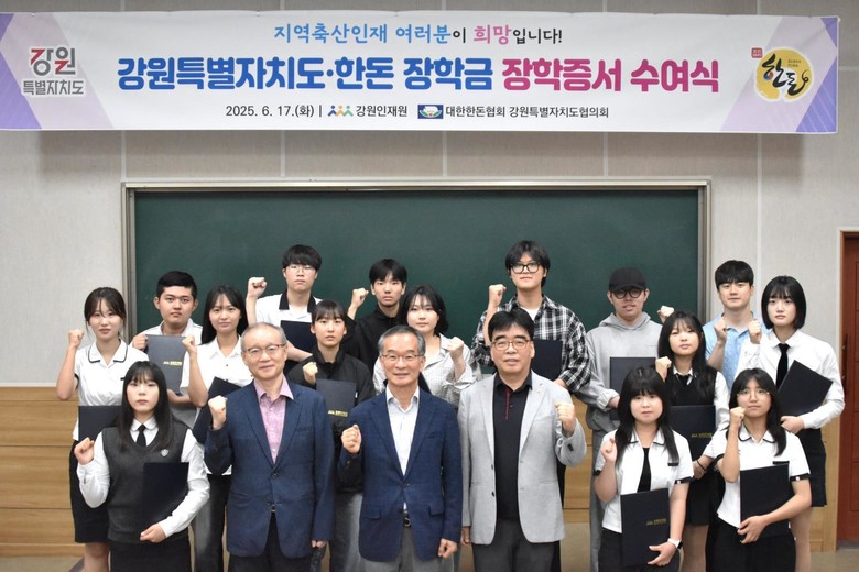 [강원도 세계타임즈=김민석 기자] 강원인재원(원장 김학철)과 대한한돈협회 강원특별자치도협의회(회장 이재춘)는 6월 17일(화) 춘천 강원대학교 동물생명과학대학에서 2025년도 「강원특별자치도‧한돈 장학금」(이하 ‘도·한돈 장학금’) 장학증서 수여식을 개최했다.