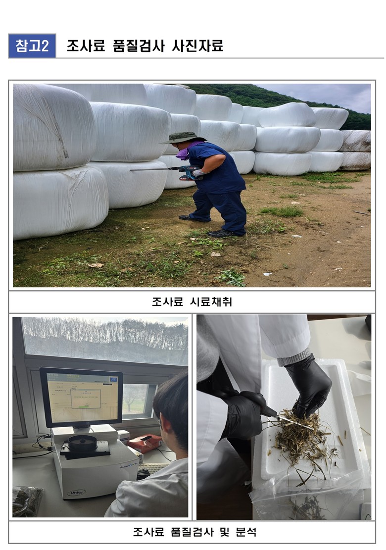 축산기술연구소는 2015년부터 실시하여 올해까지 3,139점(동계 2,239점, 하계 900점)을 검사하였으며, 검사항목으로는 수분과 조단백을 측정 하고 분석한다. 이 과정에서 근적외선분광법(NIRS)*을 이용하여 4단계**로 품질등급을 판정한다.