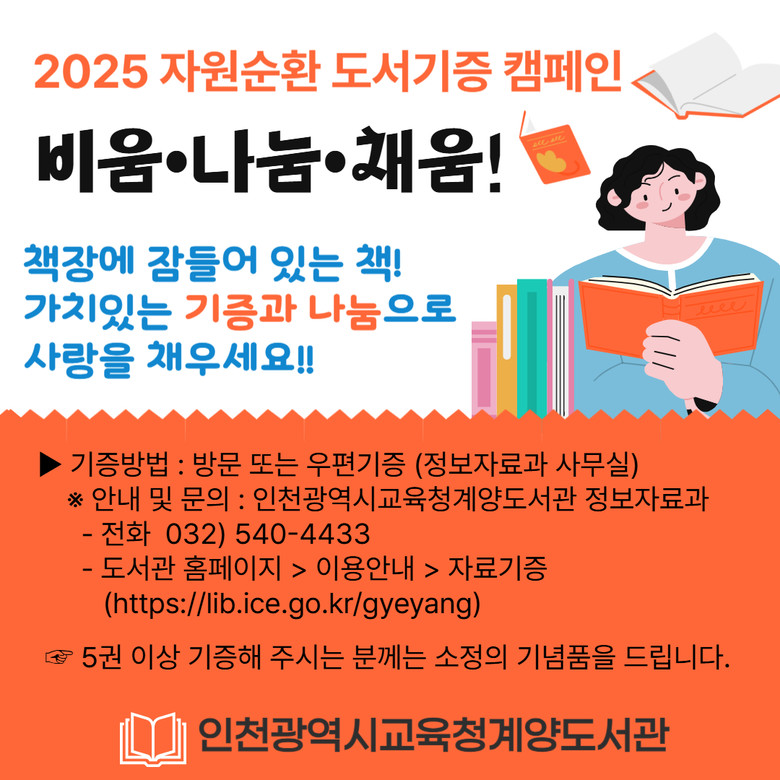 계양도서관 관계자는 “도서 기증으로 내 책장 속 잠들어 있는 책을 비우고, 지역 주민과 함께 나누는 뜻깊은 시간이 되길 바란다”고 말했다.