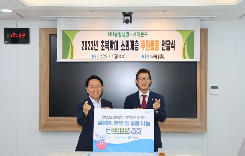 후원물품은 삼계탕 1,200봉, 한우 40kg, 볶음김치 1,200세트로 구성했으며, 전달식에서 농협생명 윤해진 대표는 이성헌 서대문구청장과 간담회를 통해 지역사회 후원에 대한 구체적인 방안과 계획을 논의했다.