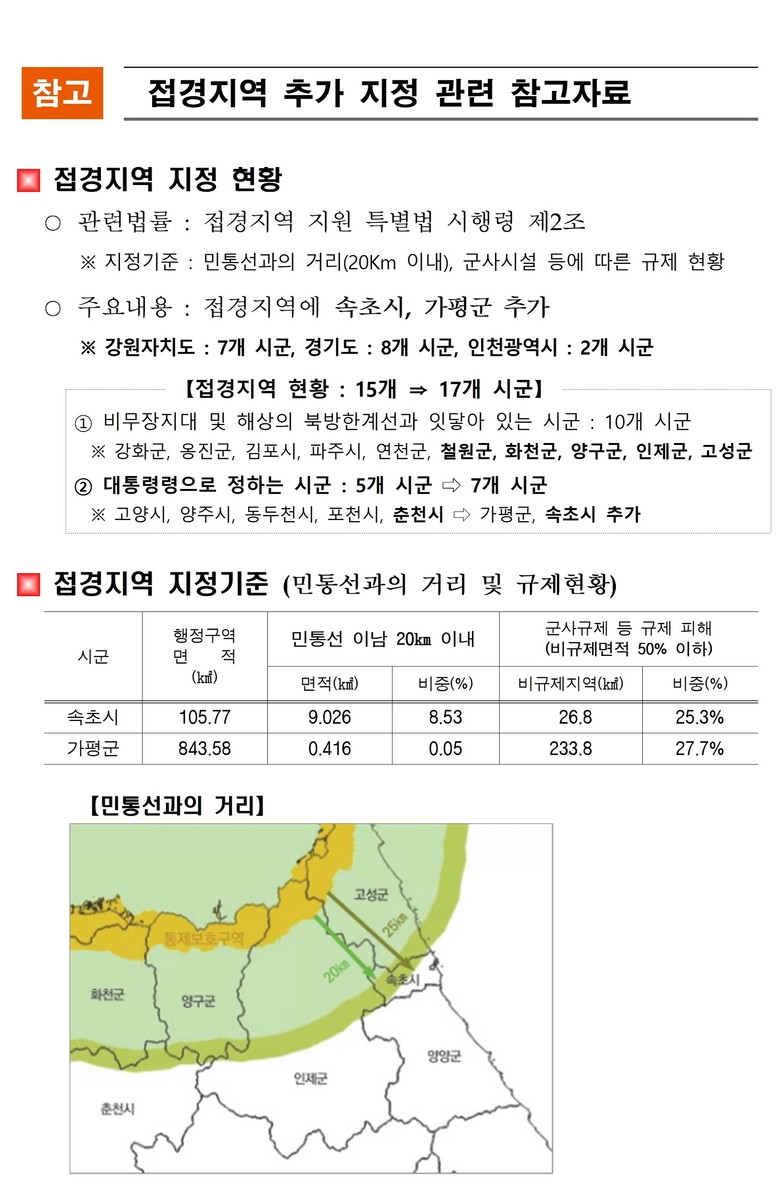 - 속초시의 경우 접경지역 시군과 지리적인 여건이 비슷함에도 불구하고 접경지역에는 포함되지 않아 그간 행‧재정적인 지원을 받지 못했다. 이에 대해 현실화 필요성이 꾸준히 제기되어 왔고, 이번에 접경지역 지원 특별법 시행령 일부 개정에 따라 속초시와 가평군이 추가로 지정되었다.