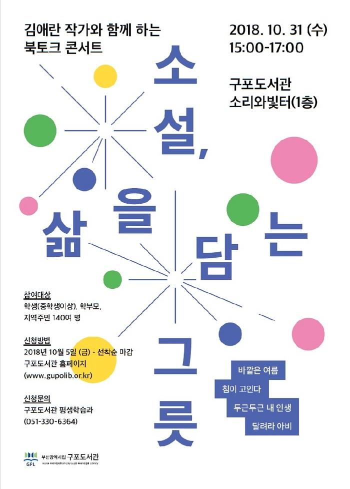 [부산=세계타임즈 장경환 기자] 부산광역시립구포도서관(관장 권영식)은 오는 10월 31일 오후 3시 구포도서관 1층에서 ‘김애란 작가와 함께 하는 북토크 콘서트’를 개최한다.