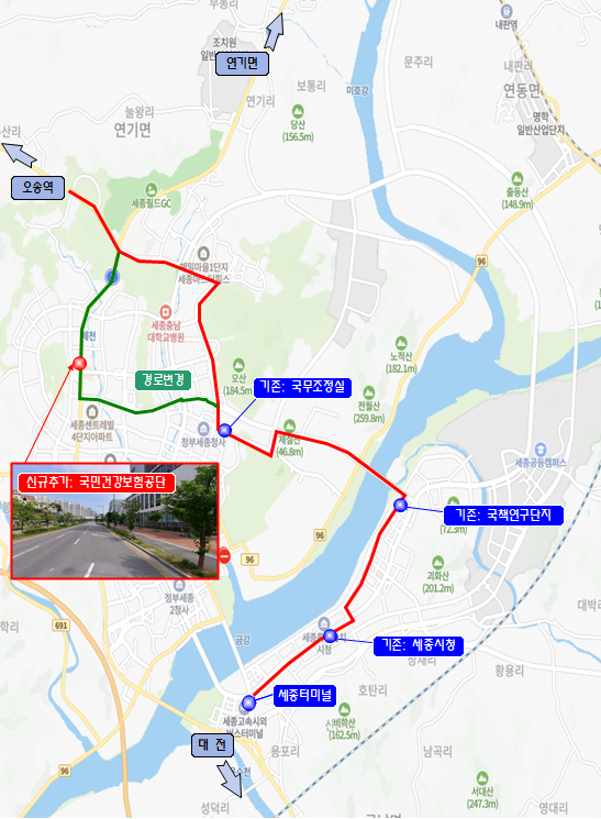 시외버스 노선은 세종터미널, 세종시청, 국책연구단지, 국무조정실, 죽전정류장(경부고속도로)을 거쳐 서울경부터미널로 향하는 기존 노선에 국민건강보험공단(아름동, 고운동) 정류소가 추가됐다.